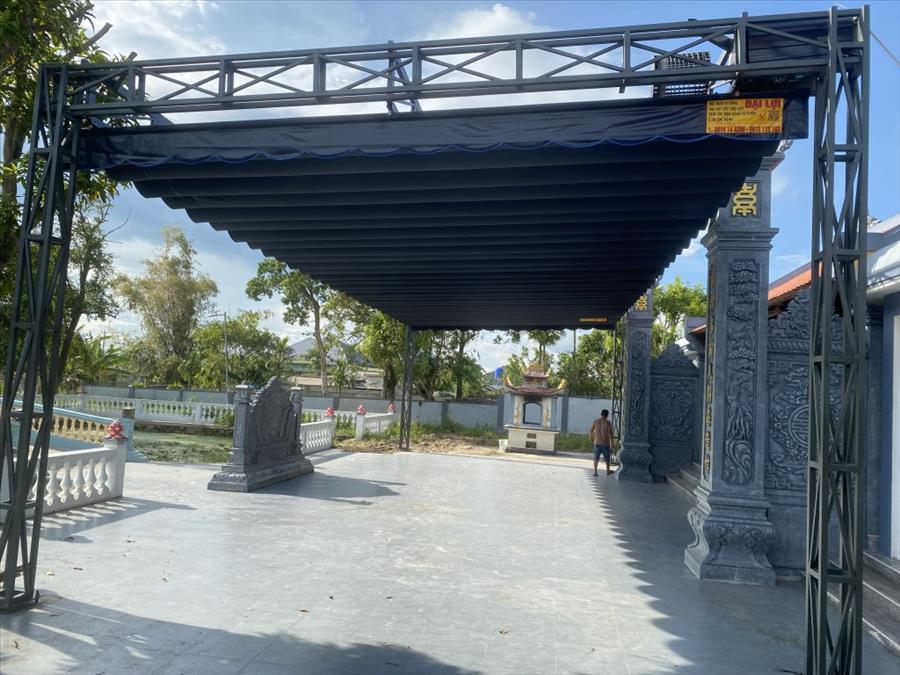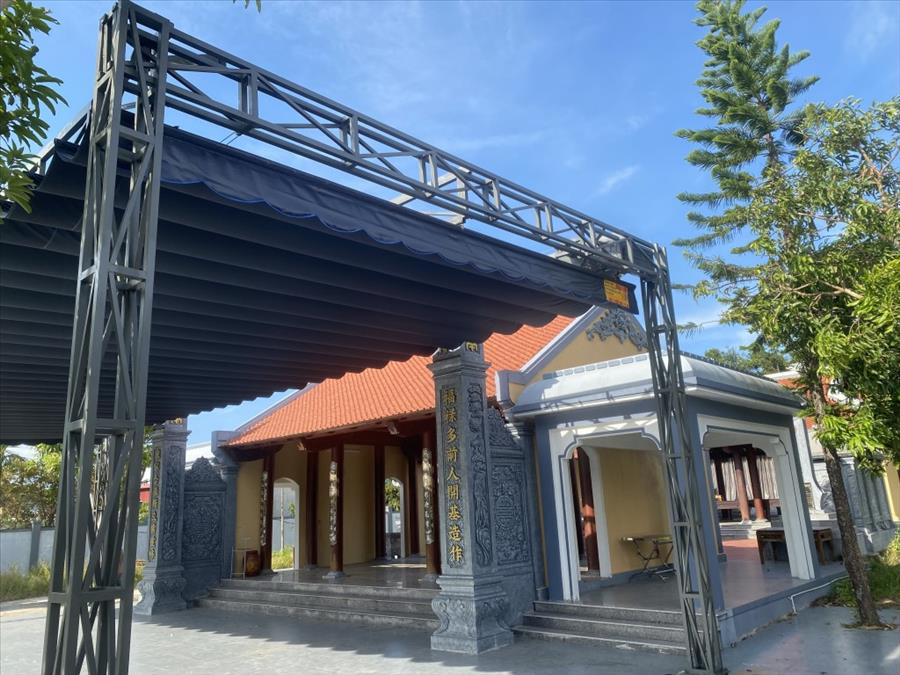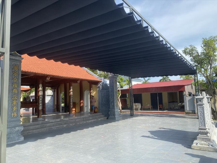 Mái che bạt xếp che sân nhà thờ dòng họ là lựa chọn thông minh, vừa đáp ứng nhu cầu che nắng mưa, vừa giữ được nét tôn nghiêm của không gian thờ cúng.